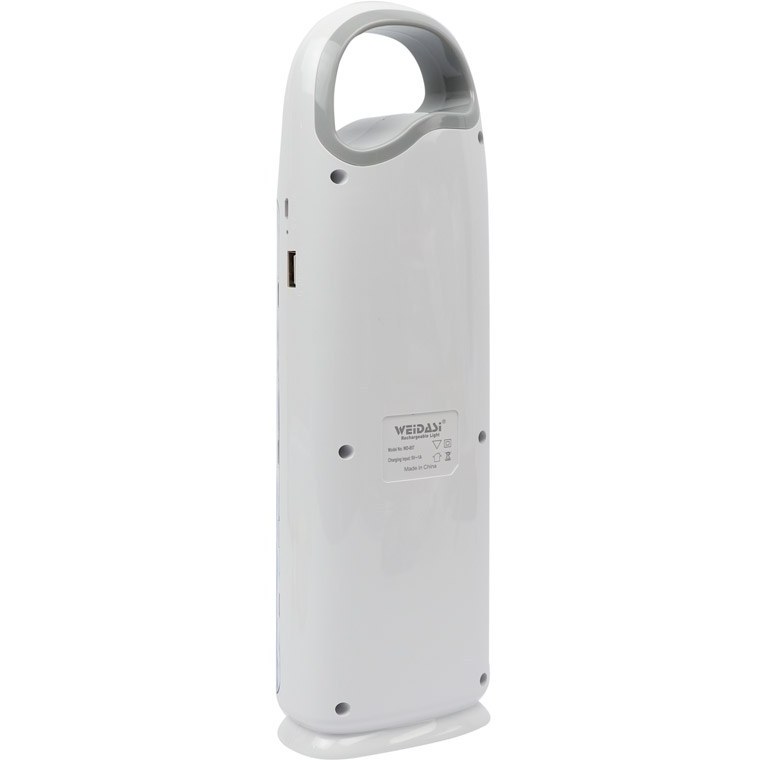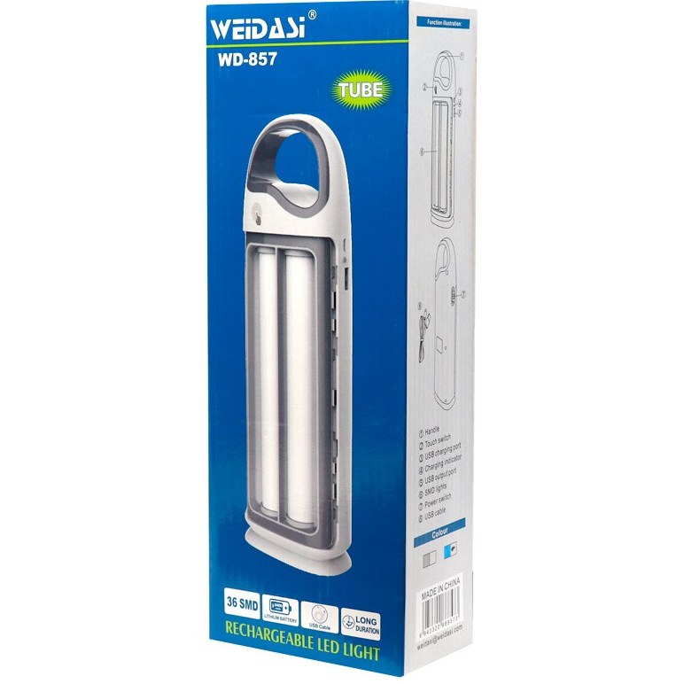 چراغ اضطراری مدل WD-857 WIDASI ، محصولی کاربردی در مواقع قطعی برق یا کمپ در شب میباشد.جنس این چراغ از پلاستیک میباشد و مجهز به 36 لامپ ال ای دی شده است.رنگ نور این لامپ ها مهتابی است که میزان نور و روشنایی آن 399 لومن میباشد.این چراغ دارای باتری داخلی لیتیومی میباشد.